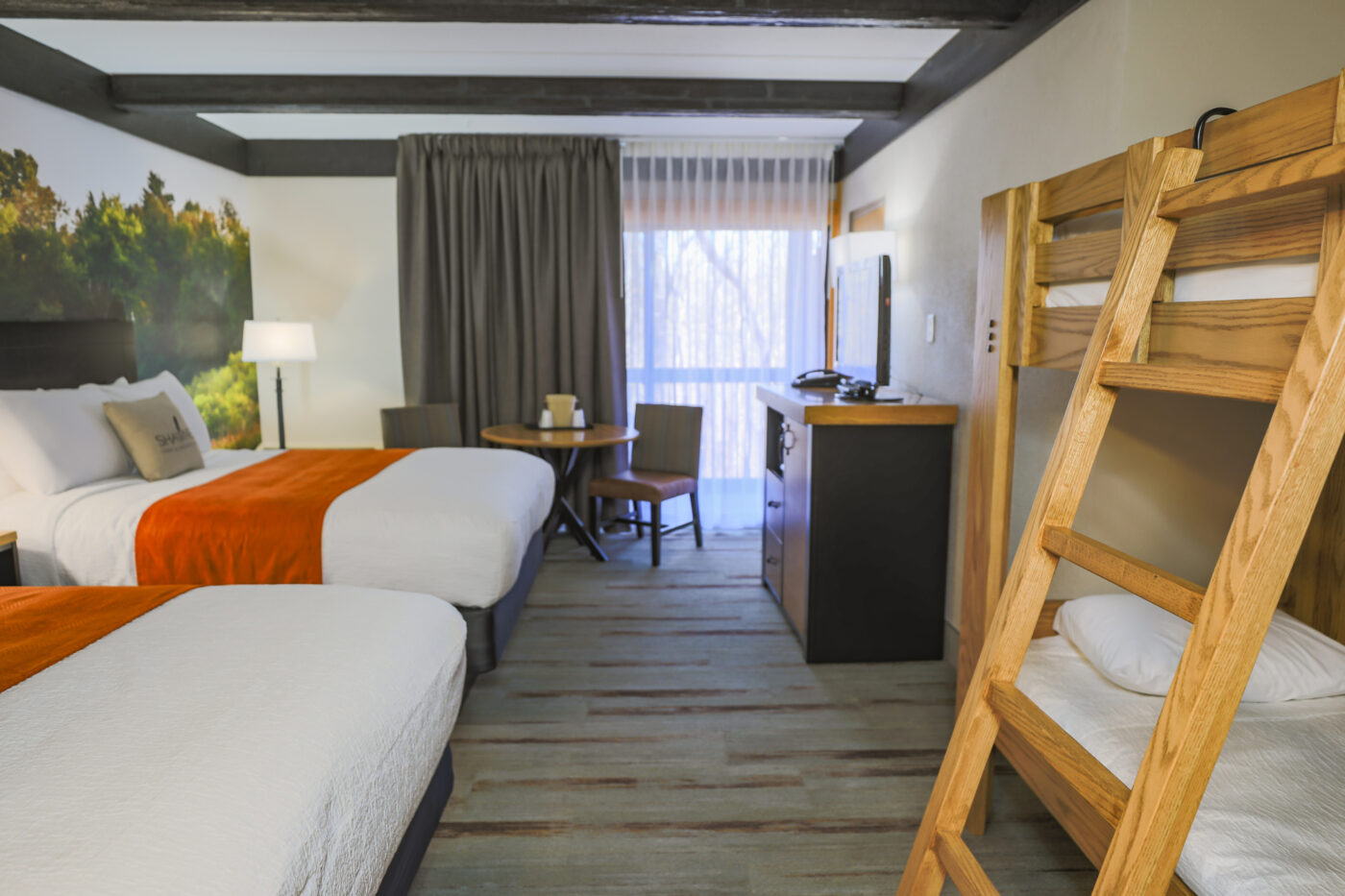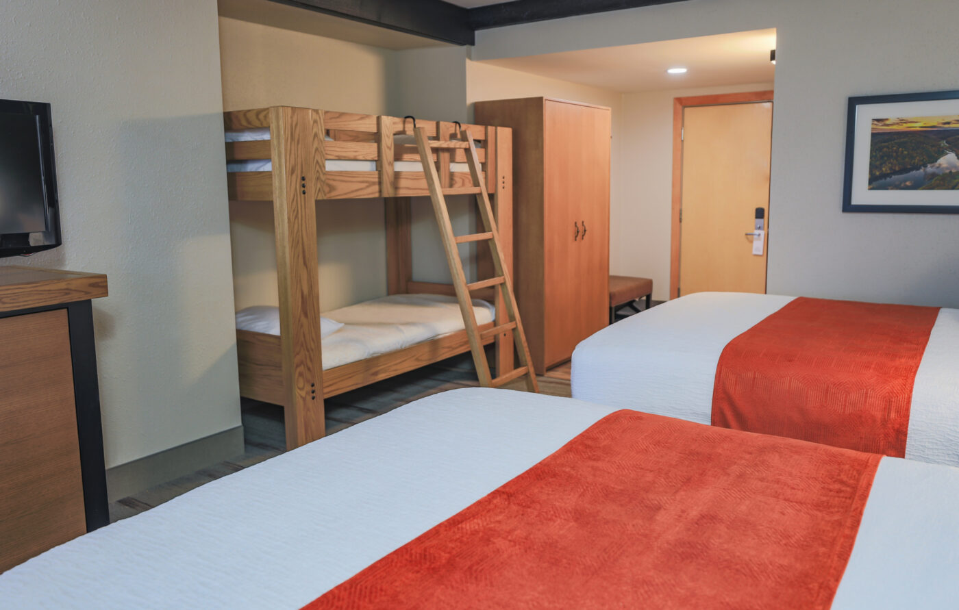These cozy bunk rooms, which are great for families, include two queen beds and one set of bunk beds. Wood view and standard view options are available.